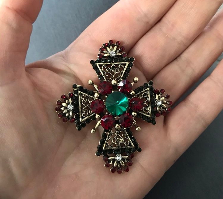 Ehtel on tagumisel küljel nii prossile omane kinnitusnõel aga ka aas riputamiseks.